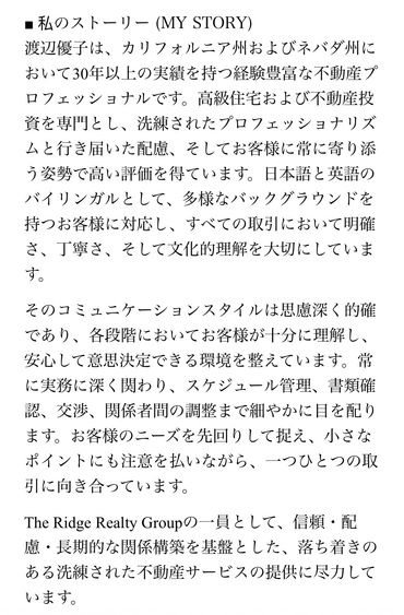 As a member of The Ridge Realty Group, Yuko is committed to delivering a refined, calm, and well-managed real estate experience built on trust, care, and long-term relationships.